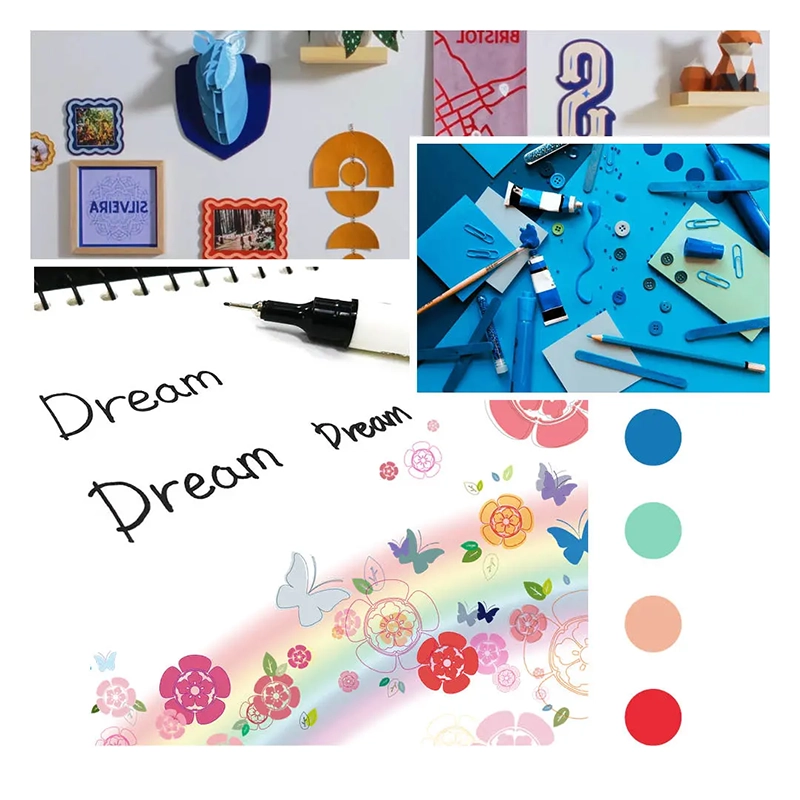 Un moodboard est un tableau d’inspiration visuelle qui rassemble images, textures, couleurs, typographies et atmosphères.